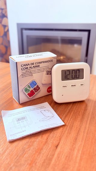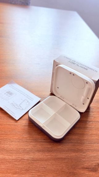 Organizador de comprimidos com alarme, ideal para guardar e lembrar de tomar a medicação. - Caixa inteligente com 5 alarmes vibratórios. - Permite programar os horários de toma. - Inclui manual de instruções.