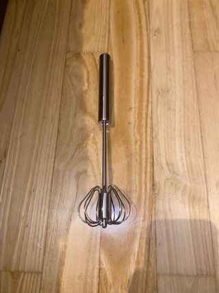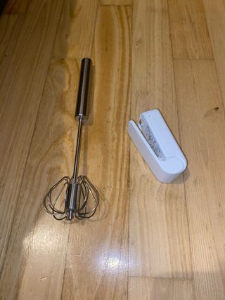 Conjunto de utensílios de cozinha. - Batedor de arame em metal. - Grampeador em plástico branco.