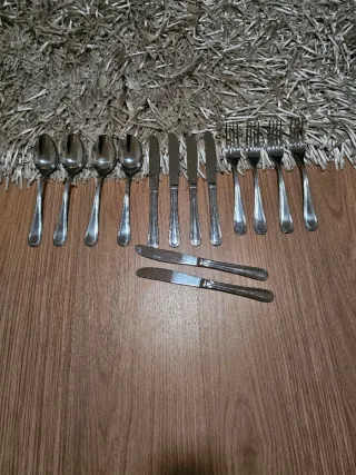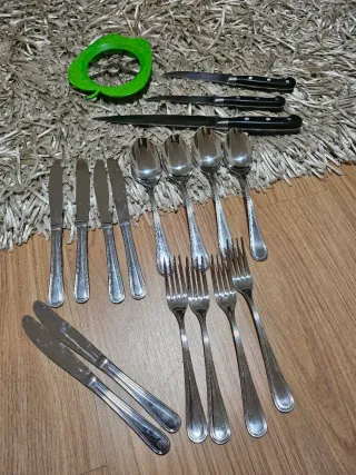 Conjunto de talheres e facas para a sua cozinha. Aço inoxidável. - 6 facas + 4 garfos + 4 colheres de sopa. - 3 Facas de corte. - Oferta do cortador de maçã verde em plástico.