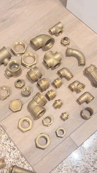 Conjunto de 32 acessórios em latão. - Peças variadas para canalização. - Material resistente e durável.