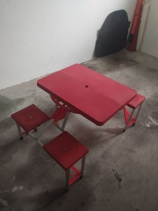 Mesa de piquenique dobrável, ideal para atividades ao ar livre. - Estrutura em metal e plástico. - Cor vermelha e prateada.