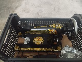 Máquina de costura Singer com um design clássico e elegante. - Detalhes em dourado. - Acabamento em preto. - Construção em metal e plástico.