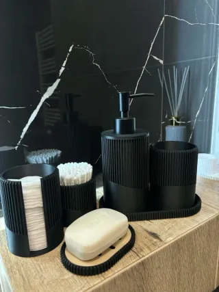 Conjunto de acessórios para banheiro com um design moderno e elegante. Conjunto de banheiro de alta qualidade, preto como nas fotos e a grade da saboneteira em branco, tudo em plastico - Dispensador de sabonete líquido. - Porta-escovas de dentes ou cotonetes. - Saboneteira com sabonete. - Porta-algodão ou discos de limpeza.