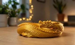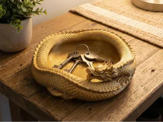 Bandeja decorativa em forma de dragão, ideal para organizar chaves ou pequenos objetos. O design intrincado adiciona um toque de fantasia a qualquer espaço. - Design de dragão detalhado. - Acabamento em tom dourado. - Formato circular para acomodar itens.