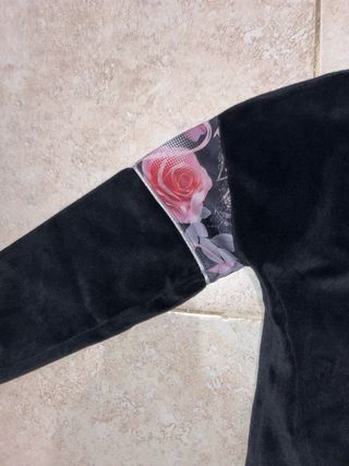 Capa preta de criança com temas de Halloween (gato, bruxa, morcego, abóbora...)