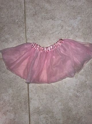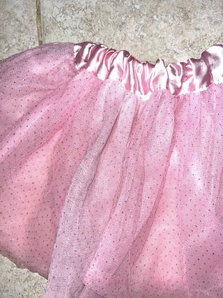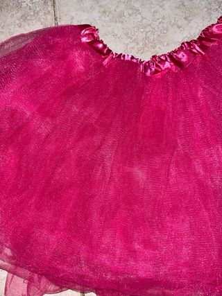 Tutu cor de rosa com brilhantes prateado. É de criança, mas nao tem tamanho. Para mais informações de tamanho, mande mensagem.