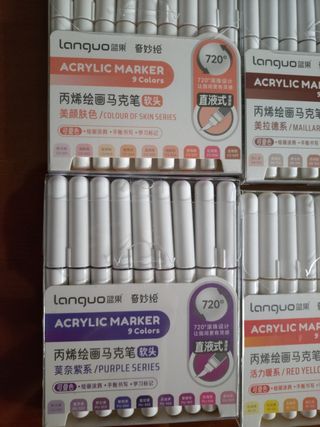 Set de rotuladores acrílicos de la marca Languo, cada paquete tiene 9 colores (hay 8 paquete en total) Puedo venderlos por separado a 10€ cada paquete asi que mucho mejor llevarte el lote (*NO* hago descuento por un paquete solo) Son rotuladores llenos de pintura acrílica muy cómodos para pintar pero sin todo el rollo de agua y pinceles y con la punta puedes hacer trazos precisos Super beginner friendly ideales para hacer manualidades y colorear pueden pintar en madera cristal plástico piedra etc y se lavan con agua si te manchas los vendo porque me dieron unos mejores pero estos perfectos para los casuales o los ahorradores