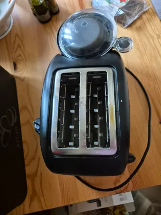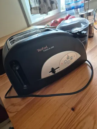 Torradeira Tefal com design moderno, ideal para o pequeno-almoço. - Cor preta com detalhes prateados. - Slots para torradas. - Controlo de intensidade de tostagem. - faz ovos e bacon em simultâneo. Muito pratica