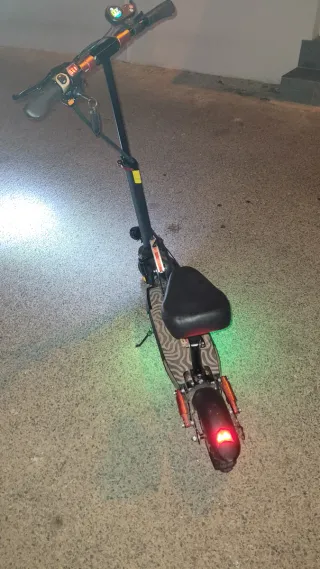 Trotinete eletrica com luzes rgb e chave. Características: 3 modos de velocidade com velocidade maxima de 45 (em descida ja cheguei a 51) Autonomia de 35 a 45 kilometros (testada e aprovada) Monitor com conta kilometros e mais opções tem apenas 700 kms Com libro oficial da mesma Rodas como novas e travões como novos sempre usada com cuidado e não para brincar. Ja não preciso muito dela apenas foi para trabalhar no verão de ai o motivo da venda. Preço negociável. Qualquer duvida mensagem