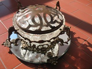 Peça antiga decorativa em vidro com detalhes em metal. - Design intrincado em metal. - Base em vidro com relevos. - Ideal para colecionadores.