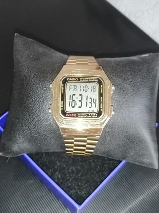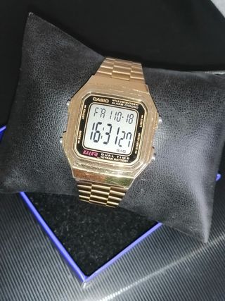 Estupendo relógio digital da prestigiada marca CASIO, modelo A178W. + 💡 Luz verde. + ⏱️ Cronômetro. + 🔔 Sinal horário. + 💦 Estanquecidade 30m. + ⏰ Alarme despertador com opção de escolher dia e mês. + 🕙🕚 Dualtime, para fusos horários com 2 horas diferentes. Horas minutos e segundos. + Caixa em resina dourada com 4 botões, 📏37,7x40,5x10,8mm. + Bracelete em aço inox dourada, 📏230x(14,8a21mm). ℹ️ Um micro risco no visor quase invisível, e bracelete com pequenos vestígios do uso obviamente. Mas no geral está em muito boas condições de apresentação e funcionamento. CV283/475.