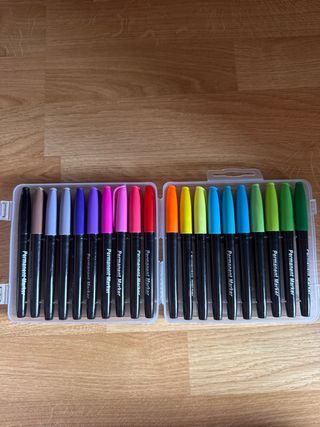 Conjunto de marcadores permanentes com uma variedade de cores vibrantes. - Inclui marcadores pretos, cinzas, azuis, roxos, rosas, vermelhos, laranjas, amarelos, verdes e azuis claros. - Ideal para diversas aplicações de escrita e desenho.