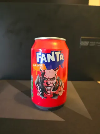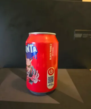 Lata de Fanta Stramberry, edição especial inspirada no filme Telefone Preto 2 - Design temático com personagem do filme. - Sabor Fruit Twist.