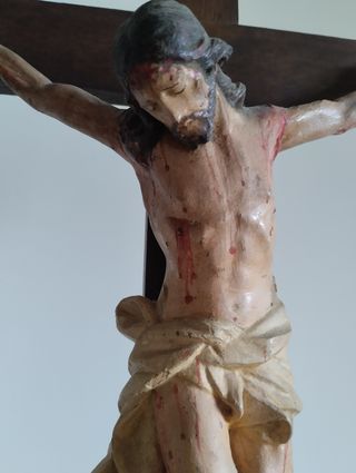 está na família há muitos, muitos anos. todo em madeira. pintado à mão. a cruz apoia em raiz de oliveira da terra santa. tem 60 cm de altura total.