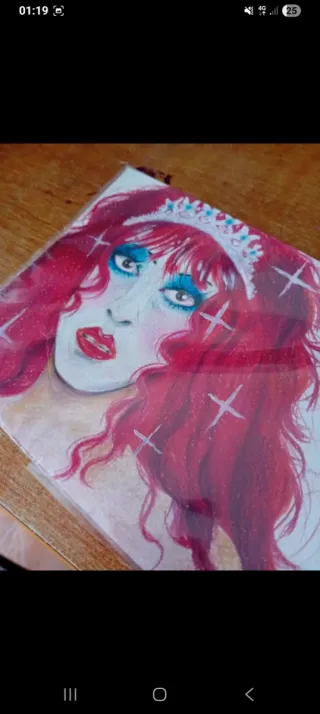 Ilustração artística feita com lápis de cor, retratando um rosto com maquiagem vibrante e uma coroa. - Detalhes em glitter e brilho. - Escrita Good Luck Babe ao lado. - Assinatura e data no canto inferior direito.
