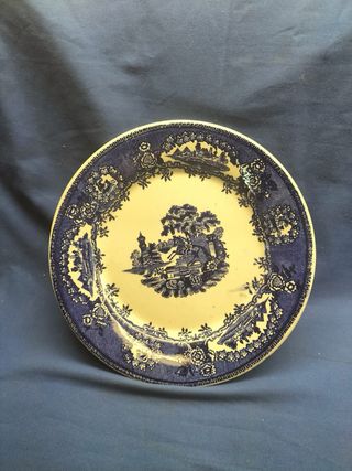 Prato raso decorado da Fábrica de Louças de Sacavém. Prato raso da Fábrica de Louças de Sacavém, decoração motivo 11, em bom estado, mede 23cm de diâmetro. - Design com paisagem oriental. - Bordas decoradas com motivos florais e geométricos. A5