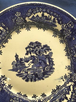 Prato raso em faiança da Fábrica de Louças Sacavém, com um bonito padrão azul. Prato raso em faiança da Fábrica de Louças de Sacavém, em bom estado sem marcas de uso, motivo "estátua azul" bastante preenchido, mede 24cm de diâmetro. - Design tradicional. - Motivo paisagístico com elementos arquitetónicos e natureza. CT29