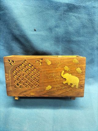 Porta-canetas em madeira nobre com detalhes em latão. Porta canetas de secretária em madeira nobre e aplicações em latão, em bom estado, mede 9cm de altura e 15cm de comprimento. - Design com elefante e padrão floral. - Acabamento artesanal. CT29
