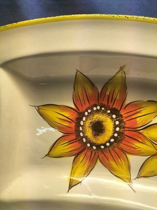 Travessa em faiança com um bonito padrão de girassóis pintados à mão. A peça tem um acabamento com borda amarela. Travessa em faiança, pintada à mão, marcada na base, em bom estado mas com pequena falha como se pode ver nas fotos, mede 44x23cm - Pintura manual. - Design de girassóis. - Borda amarela. CT29