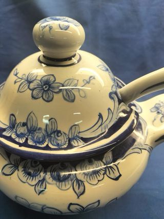 Terrina de faiança com um belo padrão floral pintado à mão. Inclui a concha. Terrina sopeira com concha, em faiança pintada à mão, marcada na base OAL - Olaria de Alcobaça, em bom estado, como nova, sem marcas de uso, mede 16cm de altura. - Faiança pintada à mão - Padrão floral - Inclui concha CT29
