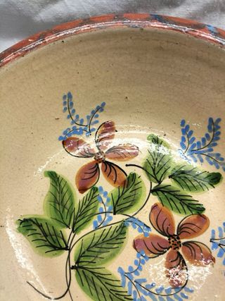 Saladeira antiga em cerâmica com um bonito padrão floral pintado à mão. Peça decorativa e funcional. Antiga saladeira em cerâmica, em bom estado, pintada à mão, mede 23cm de diâmetro e 7cm de altura. - Cerâmica pintada à mão - Motivo floral - Bom estado de conservação A2