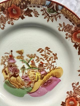Prato raso da Fabrica de Louças de Sacavém com um padrão oriental. Prato raso da Fabrica de Louças de Sacavém em muito bom estado, marcado na base, mede 23cm de diâmetro. - Design com paisagem oriental. - Borda decorada com motivos florais e geométricos. - Cores vibrantes no centro do prato. A2