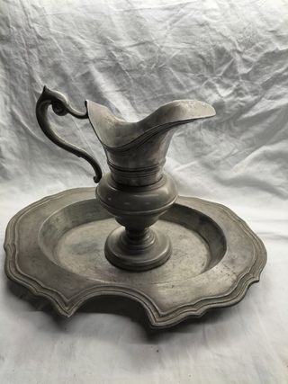 Conjunto de gomil e bacia em estanho, com um design clássico e elegante. Conjunto de gomil e bacia em estanho, frequentemente utilizado para lavar as mãos ou como conjunto de barbeiro. Material: Estanho. Função: Usado para lavagem das mãos em rituais religiosos ou profanos, ou como bacia de barbeiro. A bacia mede 38x20cm, o gomil mede 22cm de altura. - Material: Estanho - Peça decorativa e funcional A3