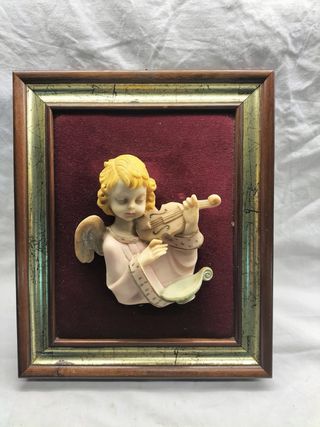 Quadro decorativo com figura de anjo ou querubim. Quadro com figura de anjo ou querubim vintage Simonetti, fabricada em Itália, representando um anjo a tocar violino. A figura é feita de marfinite, e está embutida numa moldura de madeira com um fundo de veludo vermelho. A moldura mede 31x26cm. - Detalhe em relevo. - Moldura em madeira com acabamento dourado. - Fundo em veludo vinho. A3