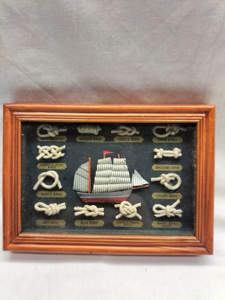 Quadro diorama Náutico com réplica de caravela e exemplificação de vários nós de marinheiro, em bom estado, mede 17x12cm. A5