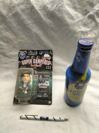 Conjunto de 3 artigos relacionados com o Futebol Clube do Porto. Lote composto por 3 artigos de merchandising do Futebol Clube do Porto, tudo sem uso, como novos. - Figura de jogador em miniatura. - Garrafa de cerveja temática. - Caneta com design do clube. A4