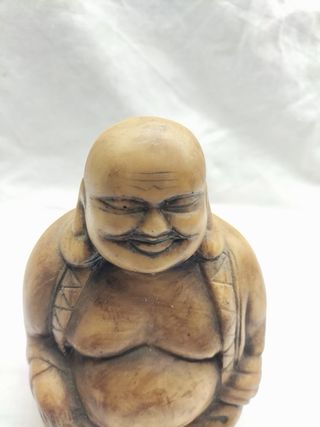 Figura decorativa de Buda Sorridente, também conhecido como Buda Feliz. Buda em marfinite, Buda Feliz ou Buda Sorridente), uma figura tradicional chinesa que representa a felicidade, riqueza e sorte, em bom estado, sem falhas, mede 15 cm de altura. - Material: Marfinite. - Design tradicional. A4