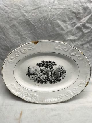 Travessa antiga em faiança, com um design clássico e elegante. A marca na base confere autenticidade e valor histórico à peça. Antiga travessa em faiança, marcada na base, apresenta marcas de uso, mede 40x31cm - Material: Faiança - Detalhe: Marca na base A6