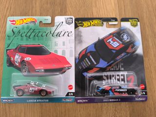 Lote de dois carrinhos Hot Wheels Premium da coleção Car Culture. - Hot Wheels Premium Lancia Stratos (Spettacolare). - Hot Wheels Premium 2023 Nissan Z (Street). - Escala 1/5 e 2/5.