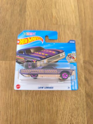 Miniatura Hot Wheels Layin' Lowrider. - Carroceria roxa com detalhes em rosa e amarelo. - Rodas rosa. - Embalagem original.