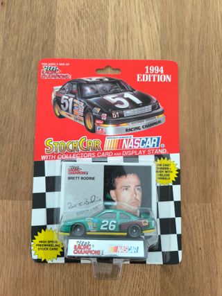 Carrinho de corrida die-cast da Racing Champions, edição de 1994, do piloto Brett Bodine. - Modelo #26 com pintura Quaker State. - Inclui cartão de colecionador e suporte de exibição. - Chassis e carroceria em metal com rodas de luxo. - Alta velocidade e rodas livres.