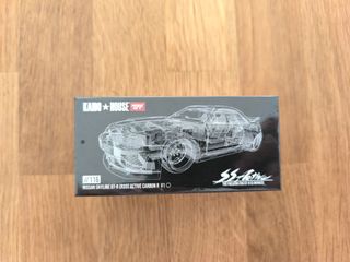Miniatura Kaido House do Nissan Skyline GT-R R33 com acabamento em carbono. - Detalhes em carbono. - Capô aberto revelando o motor.