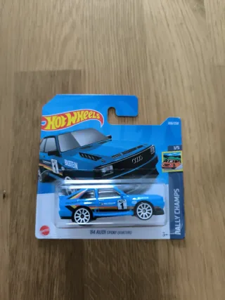 Miniatura Hot Wheels do Audi Sport Quattro de 1984, parte da coleção Rally Champs. - Carroceria azul com detalhes de corrida. - Pneus de borracha. - Escala 1:64.