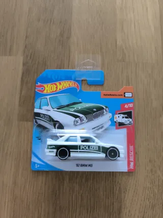 Miniatura do Hot Wheels '92 BMW M3 com temática de polícia. - Escala 1/10. - Série HW Rescue. - Design inspirado em viatura policial.
