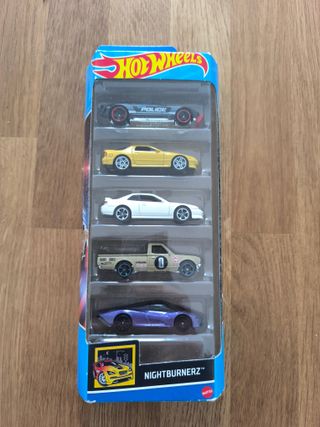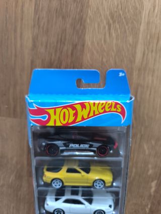 Conjunto de 5 carros Hot Wheels. - Inclui um carro de polícia preto. - Inclui um carro amarelo. - Inclui um carro branco.