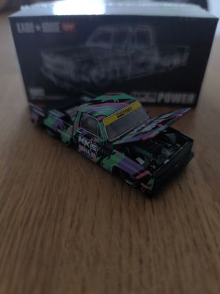 Miniatura de colecionador Kaido House Silverado HKS V1. - Design exclusivo com padrão camuflado. - Detalhes HKS Power. - Capô abre.