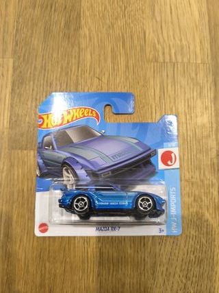 Miniatura do icónico Mazda RX-7 da linha Hot Wheels. - Cor azul metálico. - Detalhes gráficos em verde e azul. - Parte da coleção HW J-Imports.