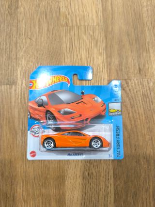 Miniatura do icónico McLaren F1 da Hot Wheels, na cor laranja vibrante. - Modelo: McLaren F1 - Cor: Laranja - Marca: Hot Wheels - Série: Factory Fresh