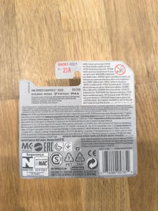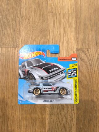 Miniatura do icónico Mazda RX-7 da Hot Wheels, parte da coleção HW Speed Graphics. - Modelo: Mazda RX-7 - Série: HW Speed Graphics - Número na série: 2/10 - Cor: Prata com detalhes gráficos