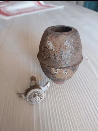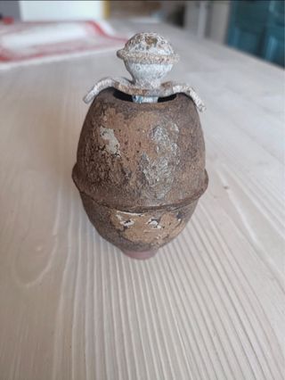 Ovo alemão da Segunda Guerra Mundial, vazio e incompleto. - Peça de colecionador. - Material: Metal. - Cor: Ferrugem com vestígios de tinta.