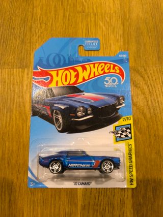 Miniatura do icónico '70 Camaro da Hot Wheels, parte da coleção HW Speed Graphics. - Modelo: '70 Camaro - Número na coleção: 153/365 - Série: HW Speed Graphics - Cor: Azul com detalhes vermelhos e brancos