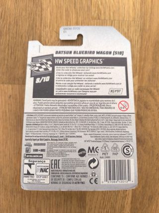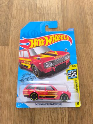 Miniatura do Datsun Bluebird Wagon (510) da Hot Wheels. Modelo colecionável com design inspirado em carros clássicos. - Cor: Vermelho com detalhes em amarelo. - Escala: 1/10. - Série: Graphics.