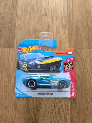Miniatura do carro Hot Wheels '67 Shelby GT-500. Modelo em escala com acabamento azul e detalhes de chamas. - Escala 1:64 - Coleção HW Flames - Número 10/10