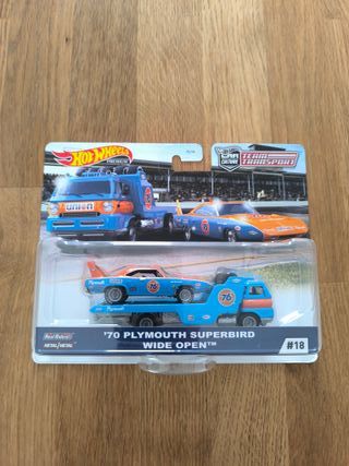 Este conjunto Hot Wheels Team Transport apresenta um '70 Plymouth Superbird. - Inclui um camião de transporte e um carro. - Detalhes em metal sobre metal. - Edição limitada #18.