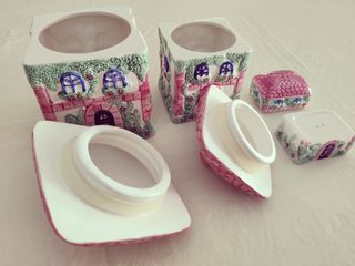 Conjunto de três peças decorativas em cerâmica com o tema Casa de Campo da Avon. Cada peça representa uma casinha com telhado rosa e detalhes em verde e rosa. - Design encantador de casinhas. - Telhados em relevo com acabamento rosa. - Detalhes de janelas e portas. Inclui - 1 conjunto saleiro + pimenteiro (casinha pequena) – 12 € - 1 caixa grande com tampa – 24 € - 1 caixa média com tampa – 20 € As peças estão em muito bom estado, sem lascas nem rachadelas. Ideais para decorar a cozinha, para guardar açúcar, café, bolachas, saquetas de chá, etc., ou para quem coleciona peças Avon antigas. Preço total se levarem as 3 peças: 50€