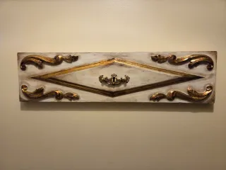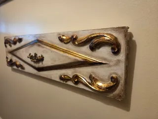 Linda talha dourada, perfeita para decoração. - Apresenta detalhes em relevo e pintura em tons de branco e dourado. - Peça única e cheia de charme. - Ideal para dar um toque de requinte a qualquer ambiente.